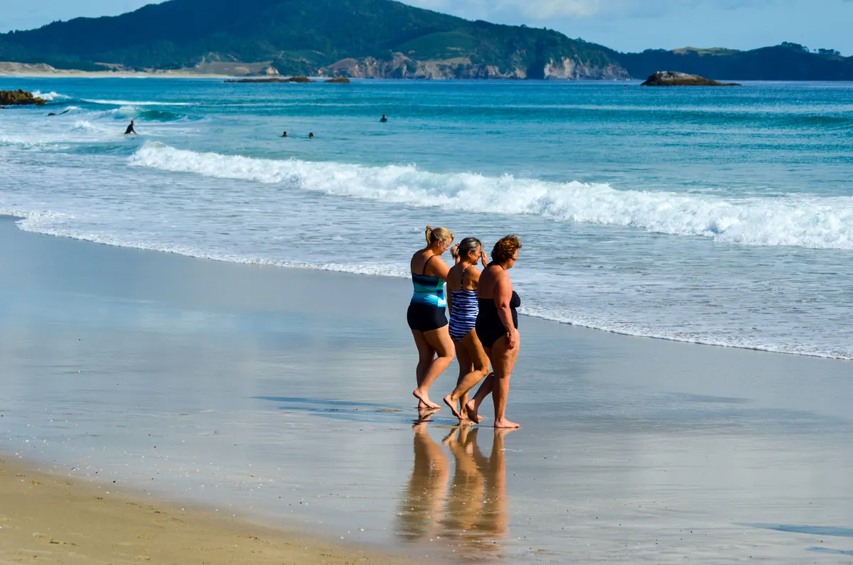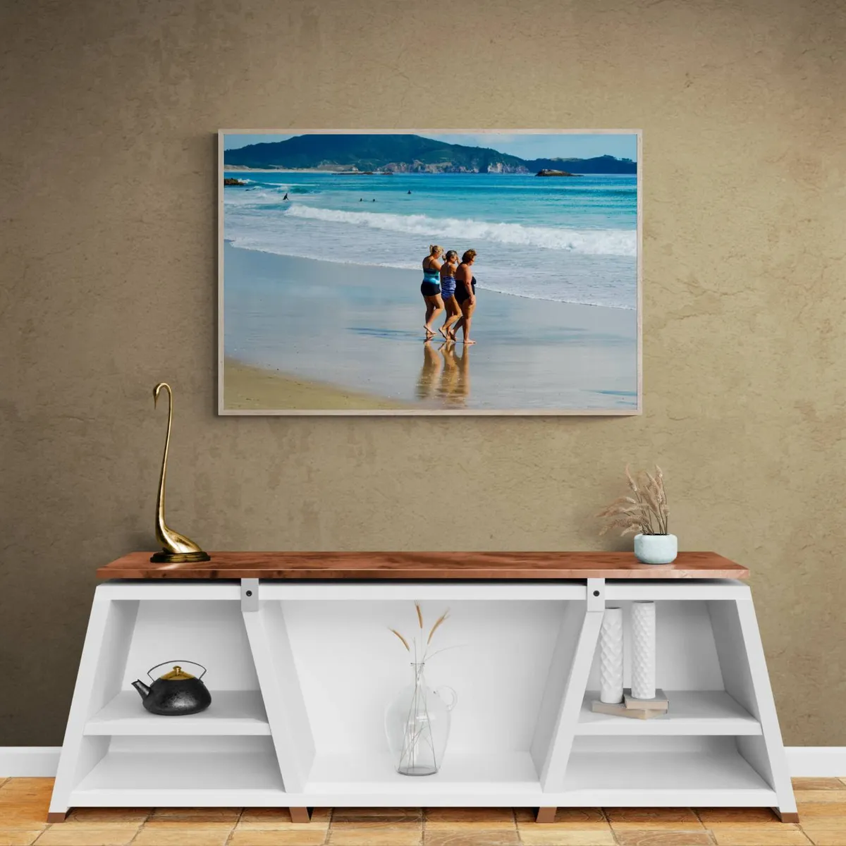 The Beach Mafia: Three mature ladies, walking only to stand ankle-deep in the waves. Their gazes lock onto the ocean, assessing swimmers with a knowing glance. No plunge into the water awaits them—only whispered conspiracies and the camaraderie of salt-kissed secrets.....................................See price list for different sizes