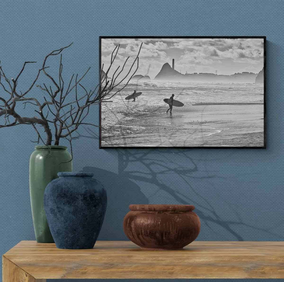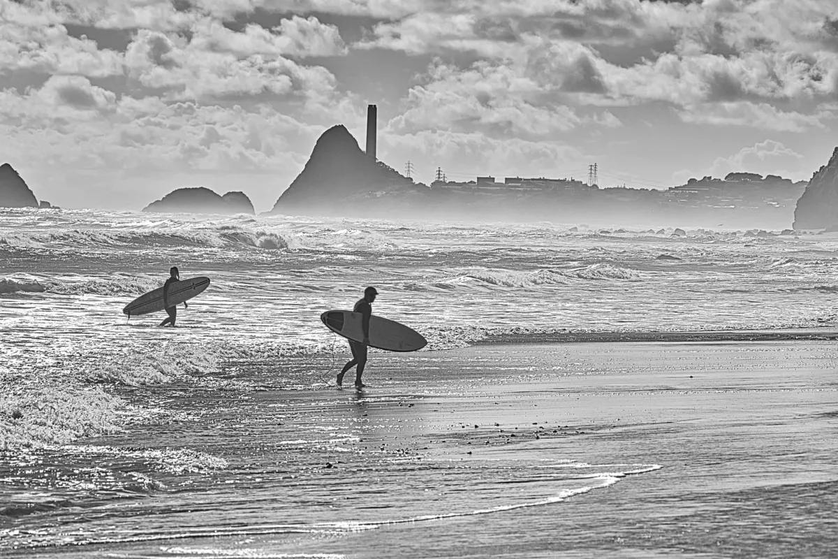Surfers emerge, salt-kissed and wind-whipped, from the tumultuous embrace of the waves at Back Beach, New Plymouth, Taranaki. Their boards, like loyal companions, trail behind. Beyond, Paritutu Rock stands sentinel, and the industrial hum of Port Taranaki echoes—a harmonious blend of nature and human endeavor....................... See price list for different sizes