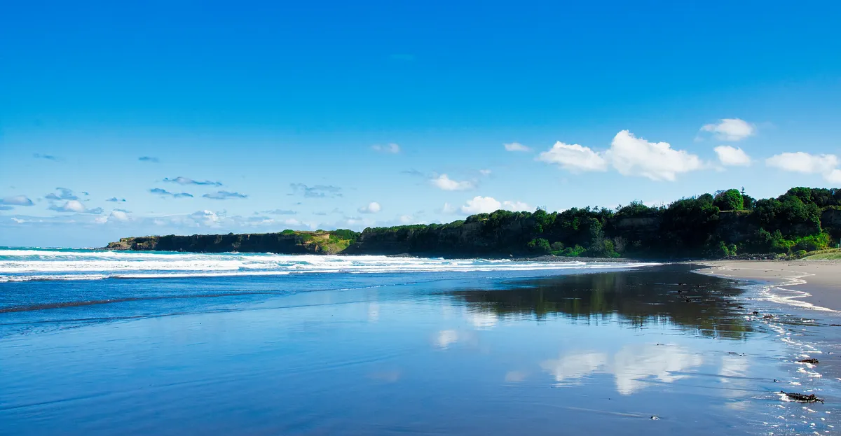 Beneath the azure expanse, Opunake Beach whispers its tale. Clear waters mirror the heavens, and as waves retreat, they kiss the black sands—a rhythmic waltz of earth and sea...................................See price list for different sizes