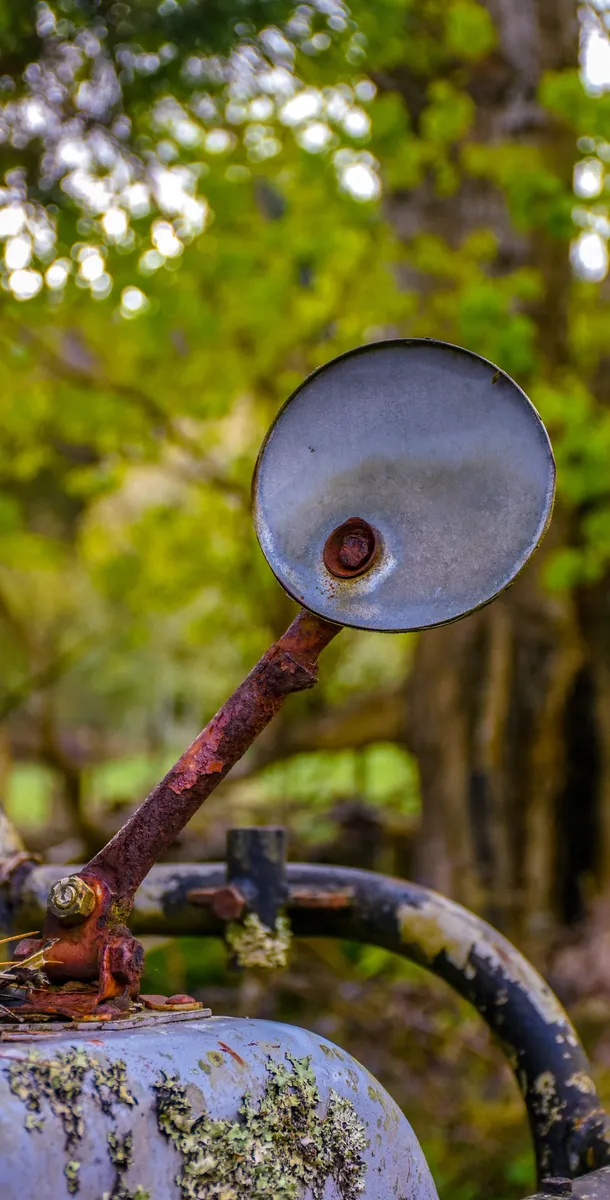 An antique mirror, part of a 1958 Land Rover, now stands weathered and glass gone. Amidst the vibrant hues of nature, it remains a time-worn sentinel, reflecting both past and present.....................See price list for different sizes
