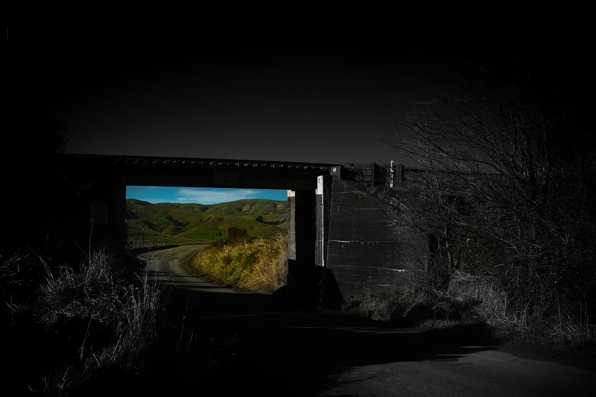 Imagine a journey down a quiet road, where monochrome shadows embrace you under the weathered railway bridge. The stark, grayscale structure stands in contrast to the vivid life beyond. Through the archway, fields of green and gold unfurl, splashed with the vibrant hues of nature. The rolling hills and expansive sky, painted in rich blues and lush greens, beckon the traveler forward. It's a dramatic transformation from the muted tones of the past to the lively spectrum of the present. This scene captures the essence of transition and the promise of adventure, inviting us to step into the vibrant unknown.