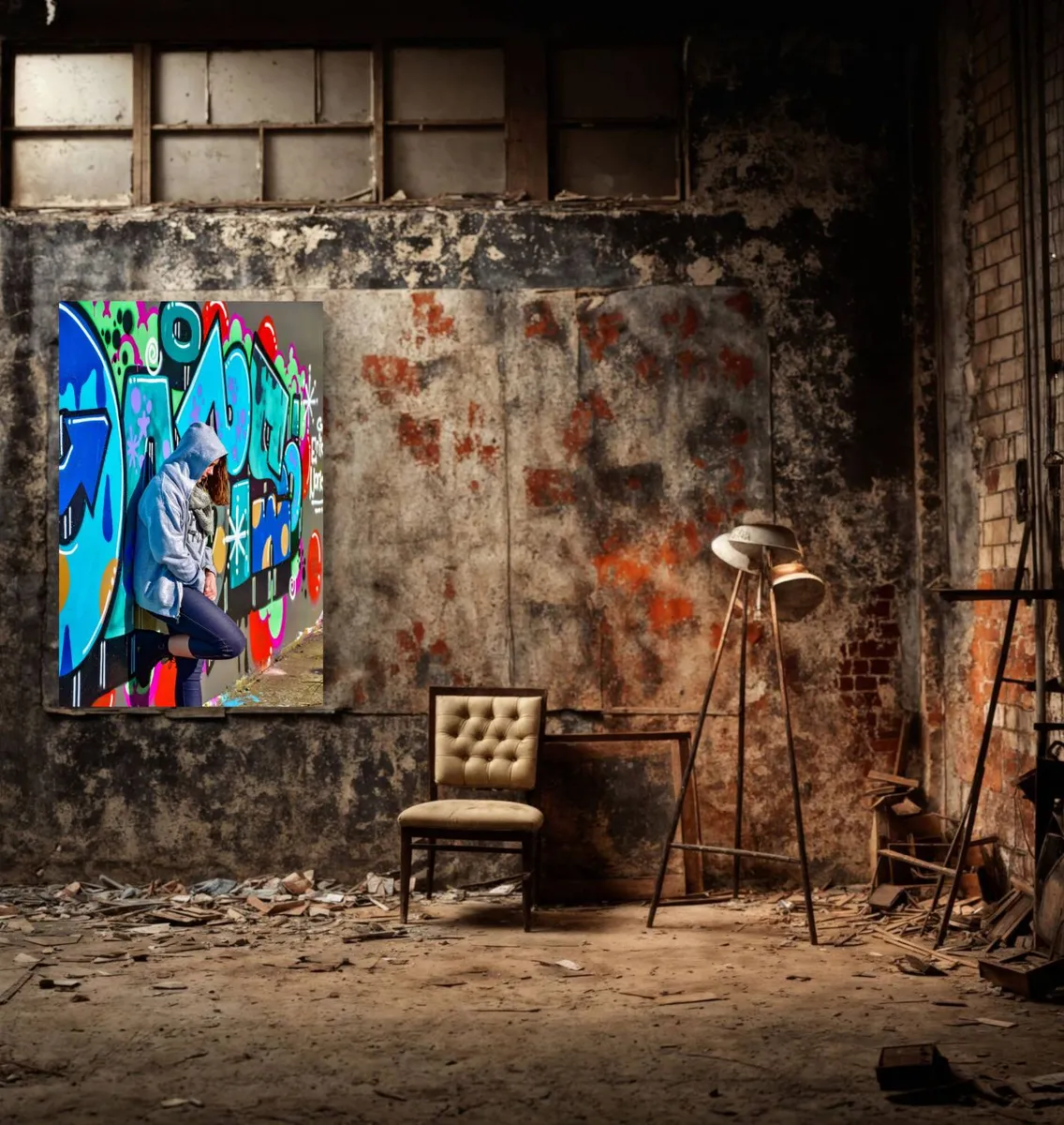 A young woman stands against a graffitied wall, hood partially covering her head. The vibrant colors of the graffiti mirror the kaleidoscope of emotions swirling within her—uncertainty, longing, and quiet contemplation............................................See price list for different sizes